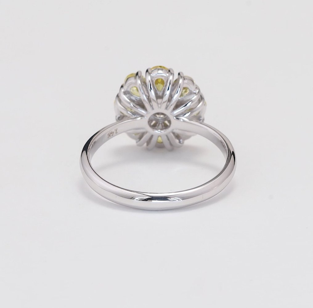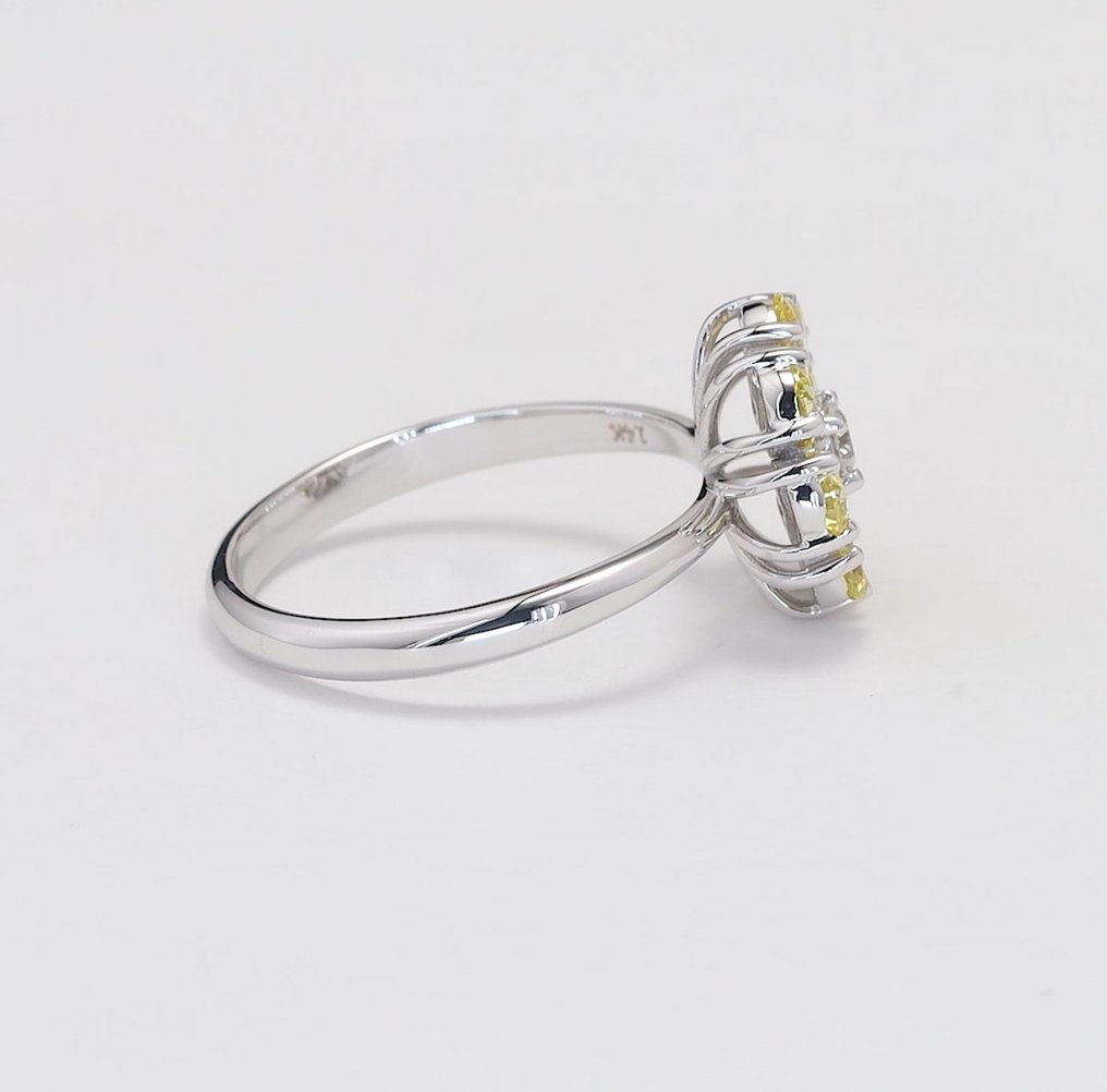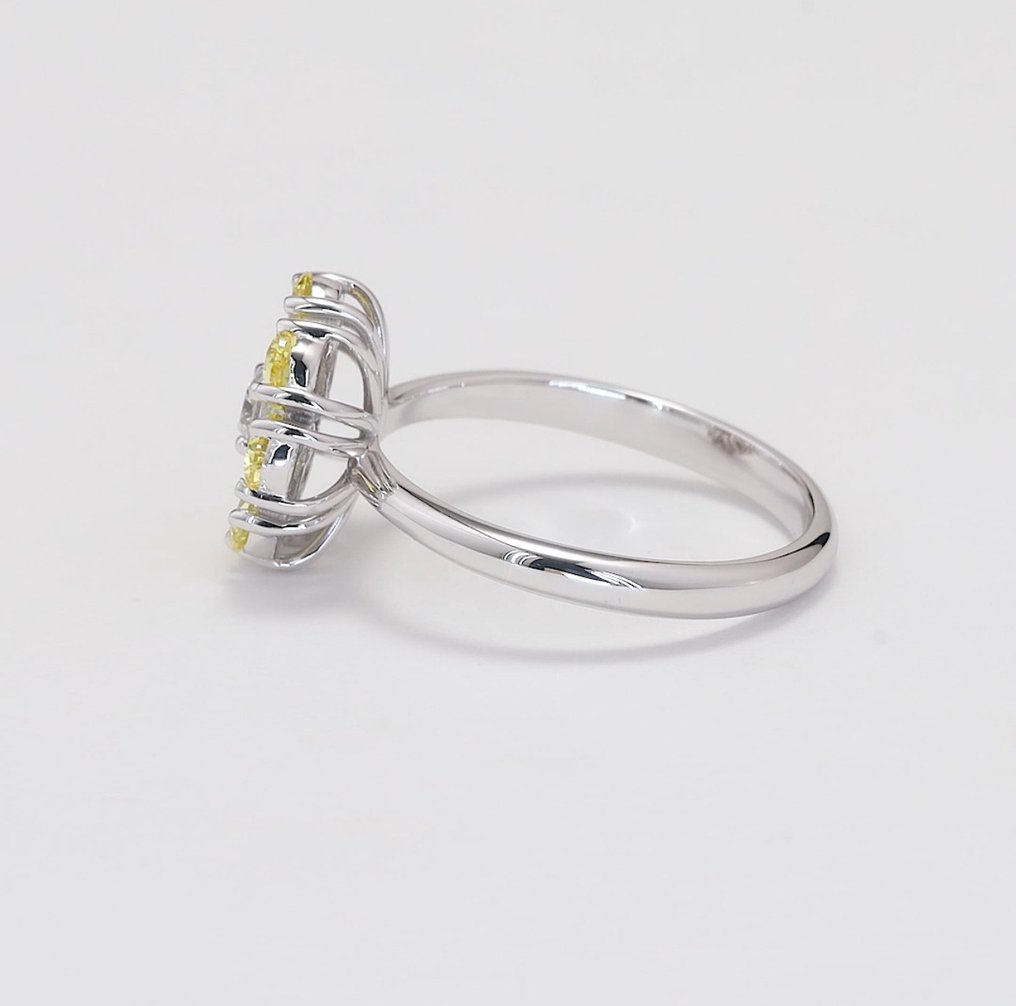 Center Lab Grown diamond has 0.10 ct weight and is E-F,VVS ,The surrounding 8 lab grown diamonds vivid and intense yellow weigh 1.21 ct
